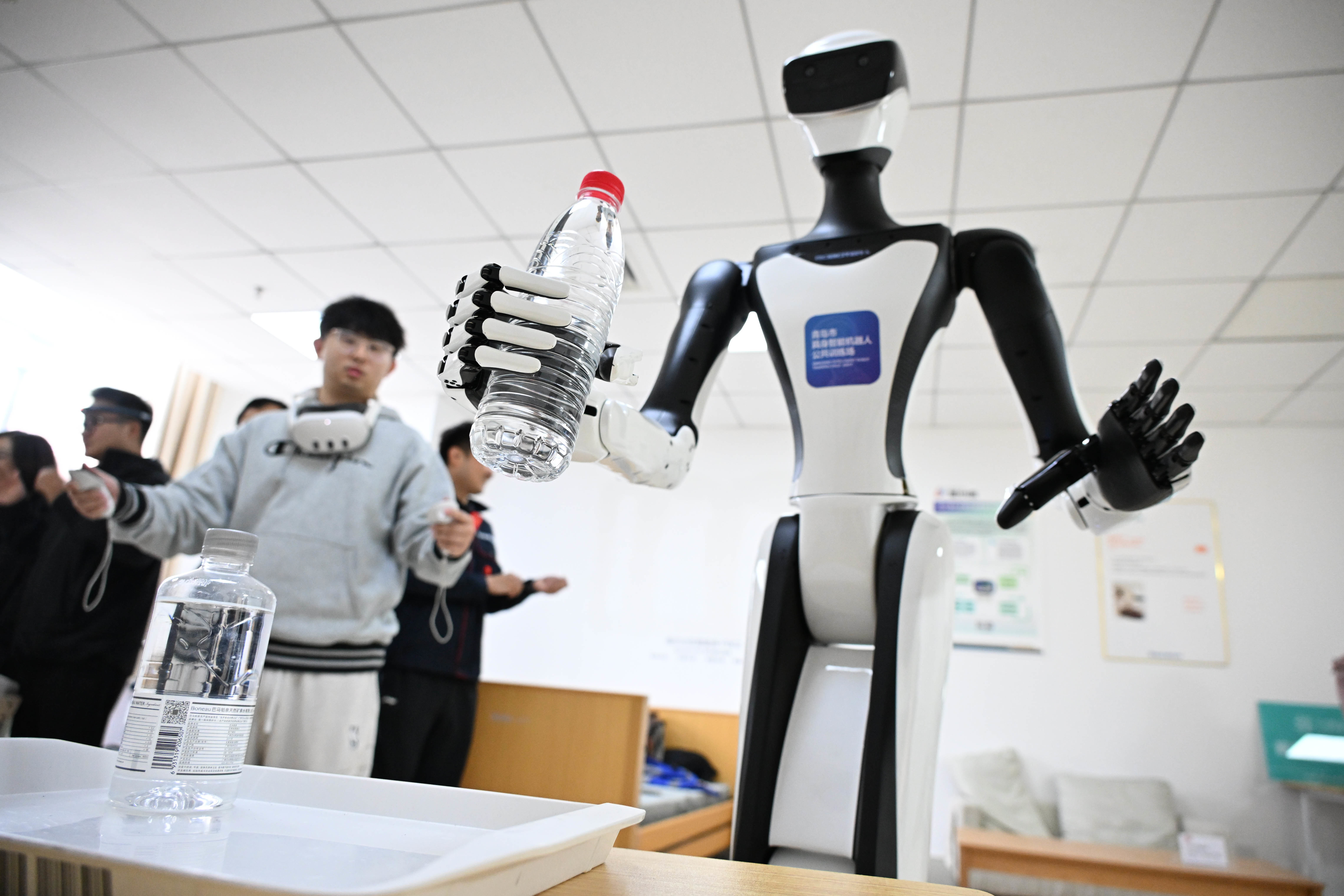 4月9日,在山东省青岛市康养领域具身机器人暨智能康复类产品训练验证中心,训练师在指导机器人练习抓取物体。
